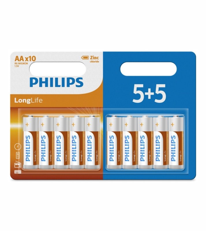 * 5+5 x AA (1,5V), řada LongLife * tyto baterie Philips zaručeně neobsahují žádné škodlivé těžké kovy, jako je kadmium, rtuť a olovo * doba skladovatelnosti až 3 roky